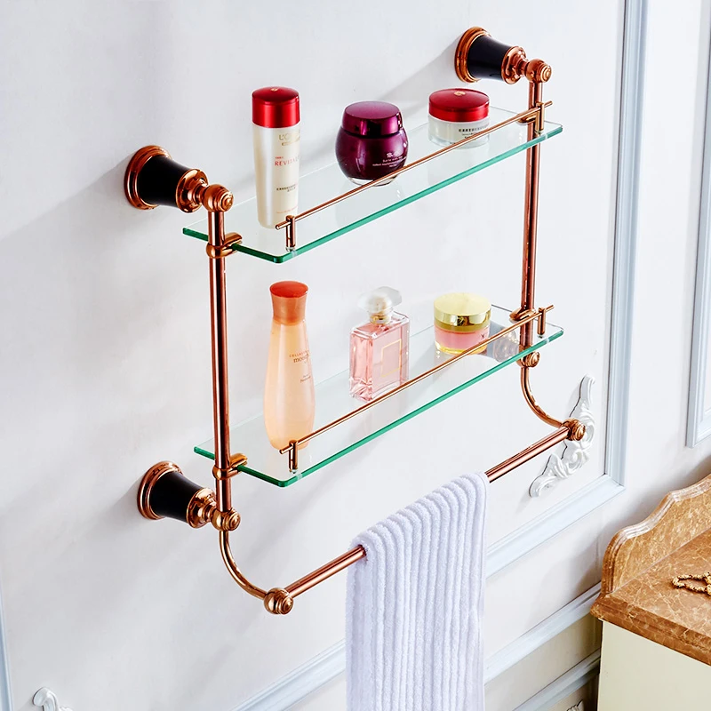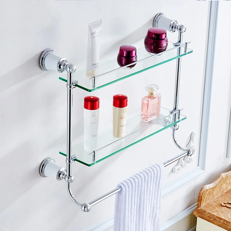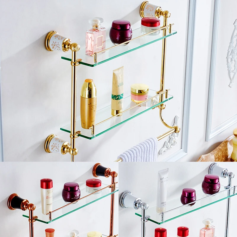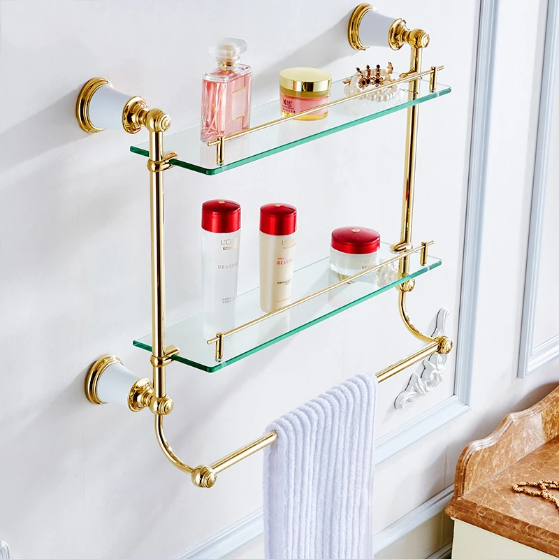 Bathroom Shelves Double Tempered Glass Rack Gold Brass Towel Bar Hanger Cosmetic Holder Home Deco Accessories Wall Shelf 87314
